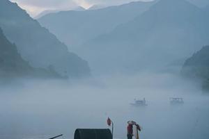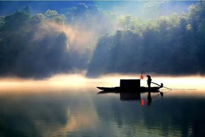 渔翁乘一叶扁舟,自雾中悠悠驶来