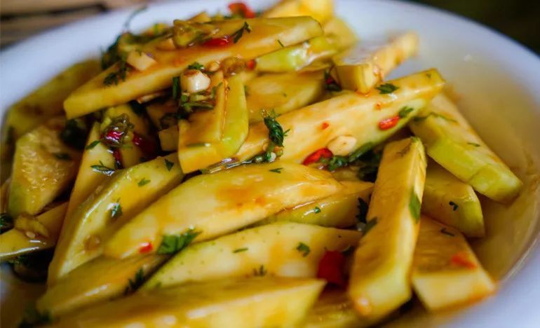 西双版纳的居民以傣族为主傣味菜以糯米、酸味及烘烤肉类、水产食品为主野生栽培植物做香料,具有独特的民族风味,来到云南,你会发现路边有很多凉拌芒果,加入当地特色的调味汁,也许你会打开一个新世界的大门!