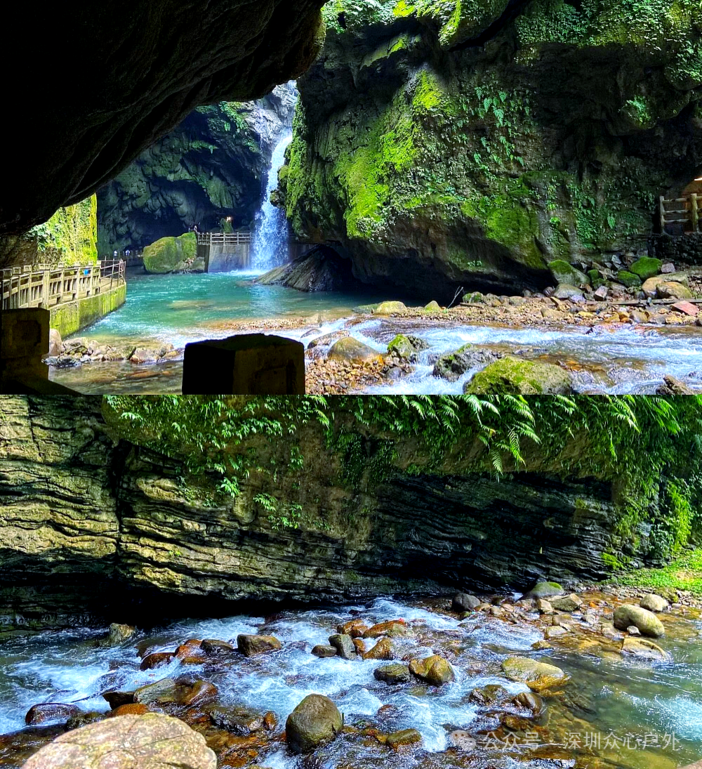 汹涌清澈的河水一头扎进"天坑",形成一个单程高达160多米的瀑布倒挂前川。雨季来临,峡谷内瀑布声如滚滚春雷;震耳发聩;旱季时节,峡谷内瀑布声如喧哗闹市,令人神往。更令人称奇的是,从天而降的大瀑布与从地下突然冒出的长约800米的地下河交汇,一起进入瀑布下方一个叫鸳鸯潭的深潭后,便又悄没声儿地消失在地下河中,不管多大的水都无法淹没峡谷。步入峡谷,但见古树老藤遮天蔽日,珍稀植物种类繁多,山涧清流急喘直下,溶洞景观天然独特。而隆隆的大瀑布则给大峡谷更增添了神秘莫测的色彩和无比壮丽的景观