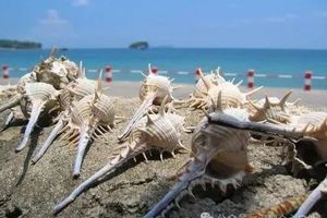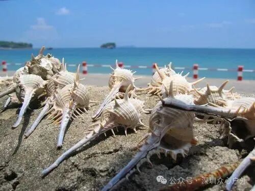 贝壳沙滩的沙子很漂亮很松软,在阳光的照射下很白,刺得人睁不开眼睛。天空与白云、海水与浪花、沙滩与茅草棚、渔船与远处的风景。夏天在这里很适合游泳和潜水。