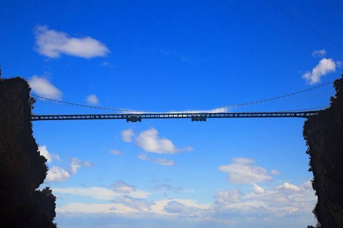 张家界大峡谷玻璃桥名"云天渡",位于湖南省张家界大峡谷景区栗树垭和吴王坡区域内,是一座景观桥梁,兼具景区行人通行、游览、蹦极、溜索、T台等功能。
