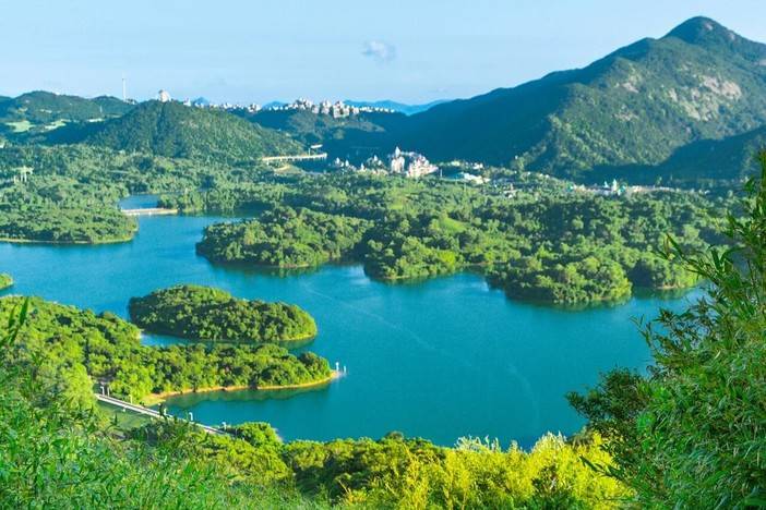 打鼓嶂,又称打鼓岭,位于深圳市坪山区、盐田区和龙岗区的交界处,海拔526米。湖中岛屿众多,这里山体蜿蜒起伏,山顶浑圆平整,远看就像一个人打鼓,由此得名打鼓嶂。很适合上山吸氧充电,是深圳热门的户外徒步地点,这里可以俯瞰到“三洲田水库”,登顶后可以看见绝美景色,拍照也很出片。有深圳版“千岛湖”的美誉。